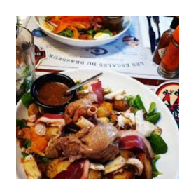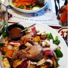 Salade assaisonnée à la vinaigrette Balsamique carottes râpées concombre tomates cerises gésiers de canars confits bleu d'auvergne AOP haricots verts persillés oeuf dur et persil