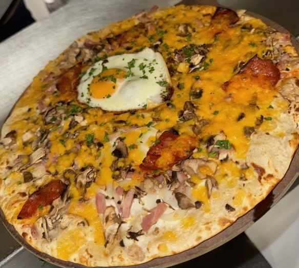 Champignons de Paris, lardons, chorizo, cheddar Galloway, œuf au plat, oignons, persil.