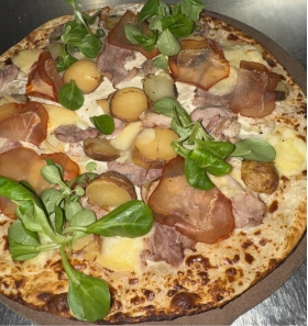 Filet mignon de porc, fromage raclette chiffonnade de Lomo pomme de terre grenailles oignons persillade et mache