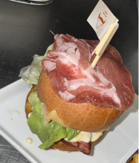 Bun brioché palette petit salé steak haché façon bouchère galette de pomme de terre sauce raclette salade iceberg chiffonnade de Coppa IGP raclette et confit d'oignons rouges