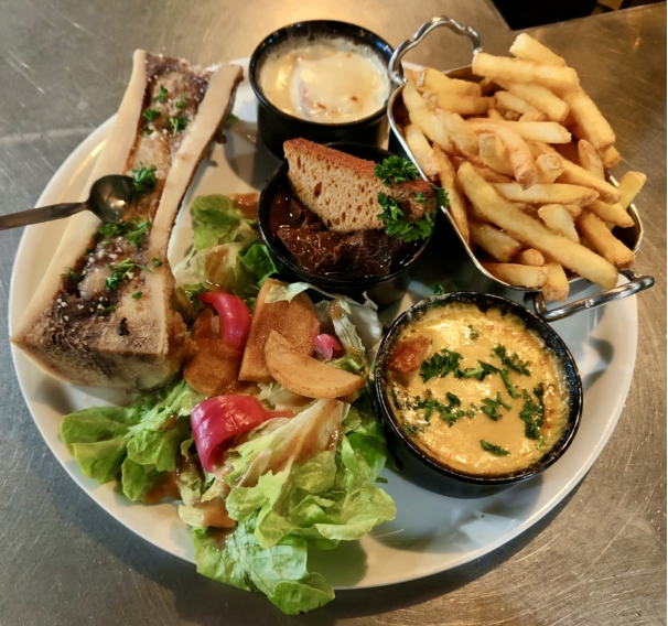 Assortiment de petits formats de nos spécialités : carbonade, welsh, comme un cordon bleu Maroilles, os à moelle & toasts.