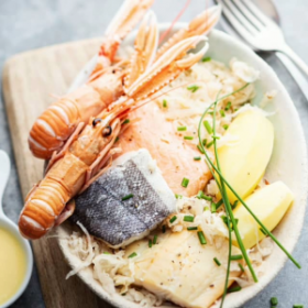Chou cuisiné aux épices et aux aromates, saumon, colin, cabillaud, haddock fumé, pommes de terre, beurre blanc, citron, persil.