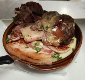 Chou cuisiné aux épices et aux aromates, saucisse fumée, saucisse knack, échine fumée, poitrine fumée, saucisson à l’ail, jambonneau à la bière 3 Brasseurs, pommes de terre, persil.