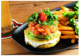 pain toasté roquette sauce pesto tomates cerises citron pickles oignon rouge et persil