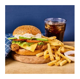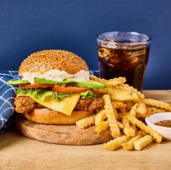 Bun Boulanger, Filet de poulet pané, Cheddar, Salade émincée, Tomates, Avocat frais, Sauce Creamy Ranch, Servi avec Frites et Boisson