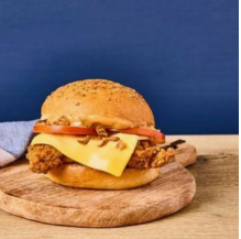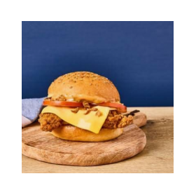 Bun Boulanger, Filet de poulet pané, Cheddar, Tomates, Oignons Frits, Sauce Spicy BBQ