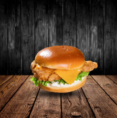 Fish burger avec poisson pané + cheddar + salade tomates et oignons