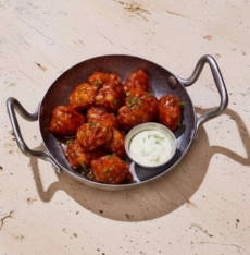 Bouchées de poulet pané enrobées d’une sauce sweet BBQ, sauce crémeuse citron vert