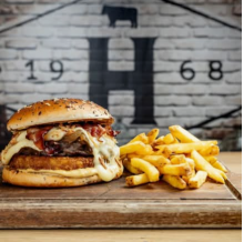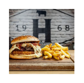 Steak haché façon bouchère, fromage à raclette fumée, galette de pommes de terre, bacon grillé, oignons confits, sauce mayonnaise à l’ail noir, oignons crispy, bun brioché