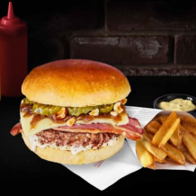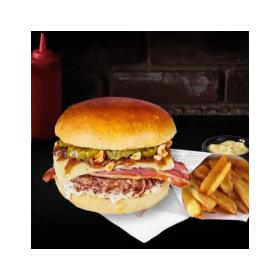 Bun brioché, haché frais façon bouchère, cantal AOP, poitrine fumée, compotée d'oignons rouges à l'américaine, éclats de noisettes grillées, pickles et sauce au poivre fumé.