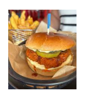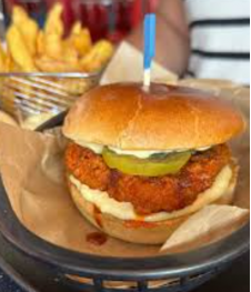 Bun moelleux tendre filet de poulet frit croustillant enrobé de sauce Nashville pickles sauce mayonnaise aux oignons