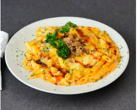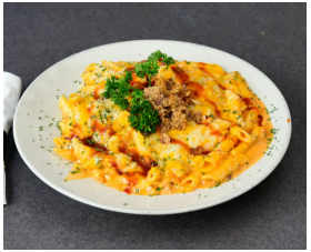 Gratin de macaronis au cheddar fondant crispy onion et ciboulette servis avec salade jeunes pousses