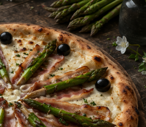 crème, mozzarella, lard fumé, asperges de pays, pecorino