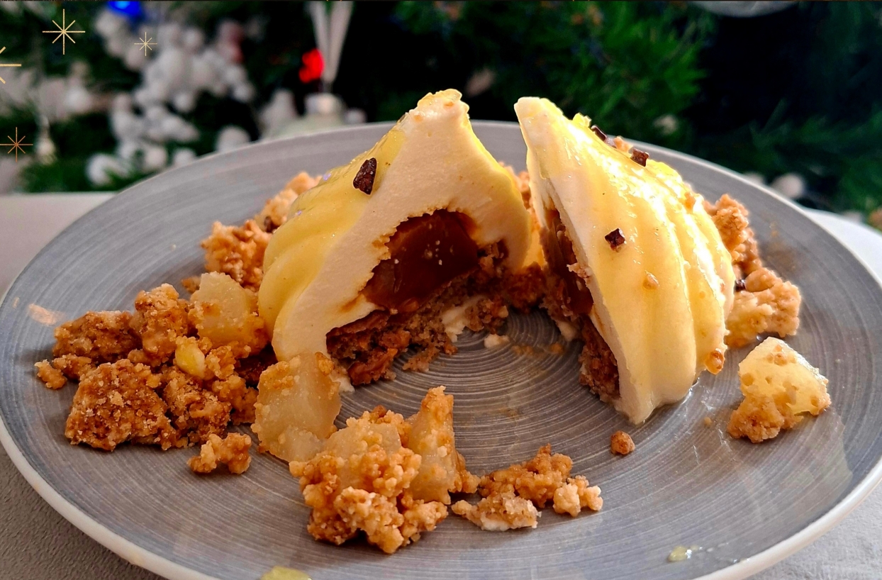 “Flamme” mousse poire Williams, inclusion croustillant caramel et cœur caramel mou, poire, crumble