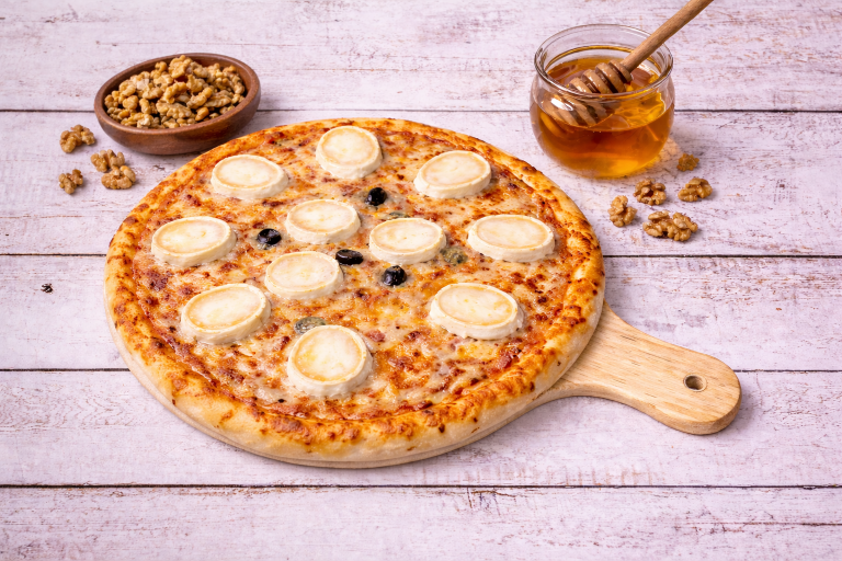 Tomate, emmental, fromage de chèvre, miel, noix.