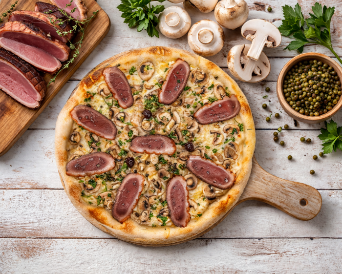 Crème fraîche, emmental, magret de canard Label Rouge (AOC Sud-Ouest), champignons, persillade, poivre vert