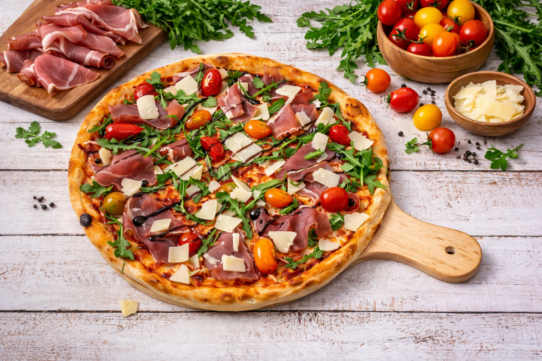 Tomate, mozzarella, jambon de Parme 24mois, roquette, parmesan, tomates cerises, crème balsamique.