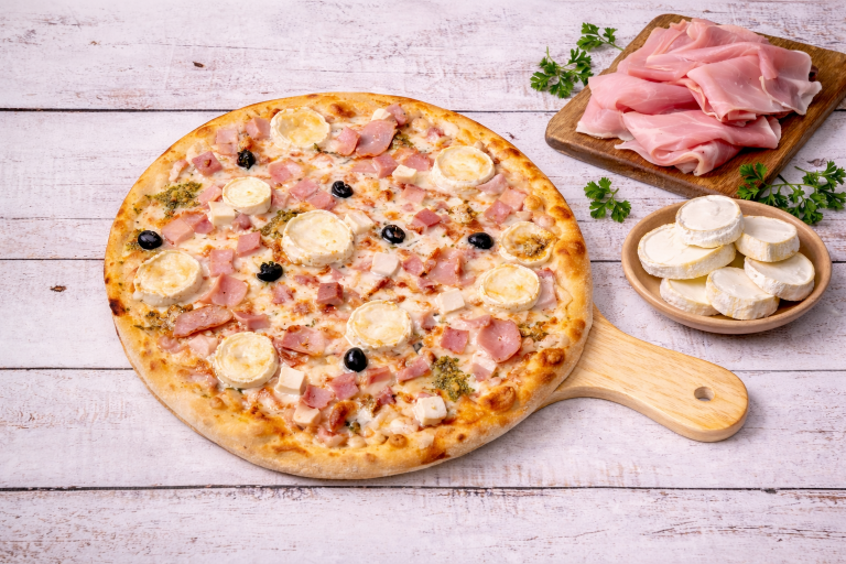 Crème fraîche, emmental, fromage de chèvre, jambon