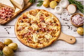 Crème fraîche, emmental, oignons, lardons, pommes de terre, reblochon